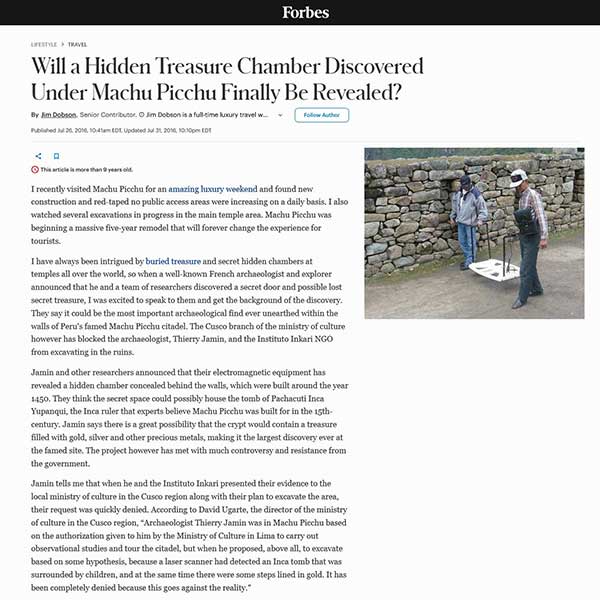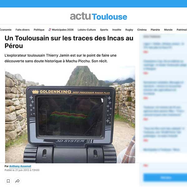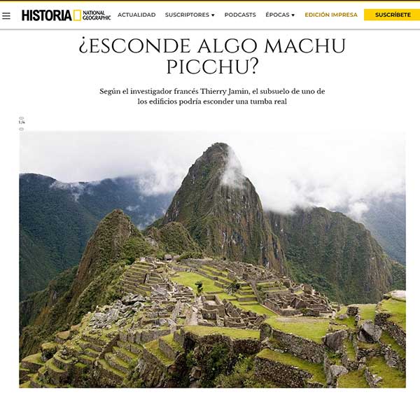 En 2012, Thierry Jamin s’embarque dans une histoire incroyable à Machu Picchu. Jamin et son équipe pensent en effet avoir réalisé une mise à jour archéologique extraordinaire dans la fameuse cité perdue, rendue célèbre par Hiram Bingham en 1911. Cette découverte fut possible grâce au témoignage d’un ingénieur français de Barcelone, David Crespy, en visite à Machu Picchu en février 2010.