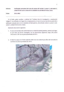 Devant l'absurdité des déclarations des proclamés « spécialistes » en génie civil, l'Institut Inkarri a demandé l'avis de 2 experts sur l'ouverture de la porte. Leurs conclusions sont très différentes des affirmations proférées par le Directeur Régional de Culture, David Ugarte Vega Centeno et par Fernando Astete Victoria, directeur du parc de Machu Picchu.